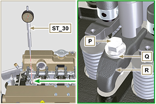 - Insert the tool ST_30 into the injector N°1 and fix it with the fixing brace R of the injector, capscrew P and washer Q.
