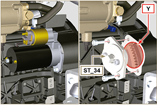 - Mount the tool ST_34 in the seat of the starter motor Y and fit it with the two starter motor fixing screws.