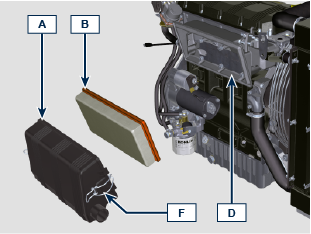 Important For safety precautions see Par. 2.4. Before proceeding with operation, read Par. 3.2.2. Do not use the engine with the oil level below the MIN. Do not exceed the MAX level on the dipstick. Filling Loosen the oil filler cap A. Add the oil of type recommended (Tab. 2.2). Before checking oil engine needs to be level. Remove the oil dipstick B and check that the level is up to but does not exceed the MAX. If level is not at the MAX. level, add additional oil. Re-tighten the cap A, C. Oil level check Perform the operations from point 3 to 6. Oil replacement NOTE: Perform this operation with warm engine, to get a better fluidity of the oil and get a full discharge of oil and impurities contained in it. Loosen the oil filler cap A. Unscrew the oil filter F with appropriate wrench. Assembly and tighten the new oil filter cartridge F (torque to 15 Nm). Remove the oil dipstick B. Remove the oil drain plug D and the gasket E (the oil drain plug is on both sides of the oil sump). Drain oil in an appropriate container. Replace gasket E. Tighten the drain oil plug D (tightening torque at 35 Nm). Add the type of oil approved (Tab. 2.2). Fit and remove the oil dipstick B to check the level. Pour in fluid until reaching the MAX level mark. Upon completion, reinstall the oil dipstick B completely. Tighten the cap A, C.