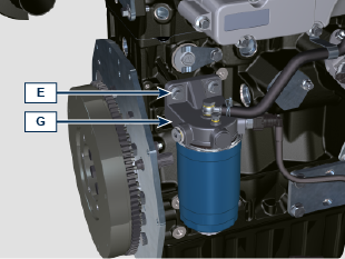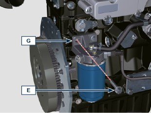 - Fasten the fuel filter bracket G with screws E (tightening torque 25 Nm).