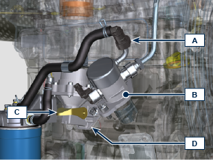 - Push the lever C of the fuel feed pump D till the fuel spills from connector A.