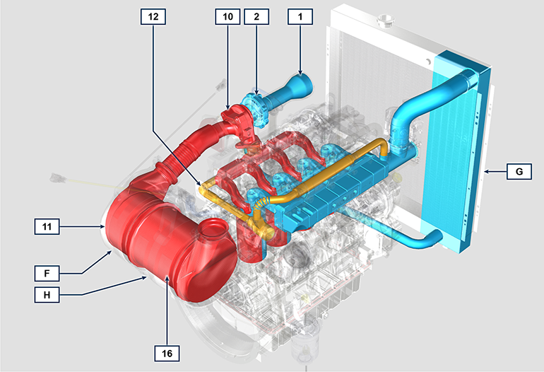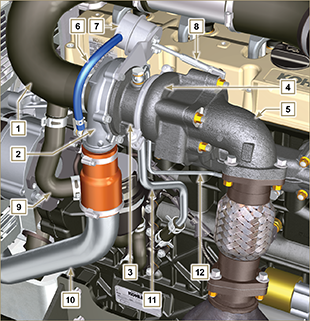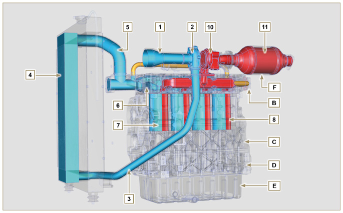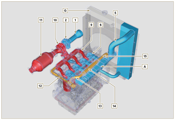 Filtered air is sucked by the turbocharger, which compresses and sends it to the intercooler (as a consequence of compression, the air increases the temperature - the Intercooler cools it - this process enables better performance during combustion inside the cylinders). From the Intercooler, it is sent to the intake manifold and, via ducts in the cylinder head, enters the cylinders. Compressed air inside the cylinders and mixed with the fuel transforms into Gas after combustion. The gas is expelled from the cylinders and sent to the exhaust manifold. The exhaust manifold sends the Gases to 2 ducts: