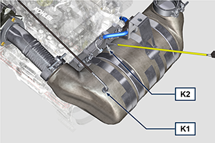 The EGTS sensors K1 and K2 are placed on the ATS system, K1 with black wire before the DOC, K2 with yellow wire after the DOC.