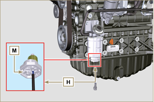 It is a N/C sensor, calibrated at 0.6 bar ± 0.1 bar. With oil low pressure the sensor closes the electrical circuit and the warning lamp in the panel board switches on. |